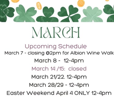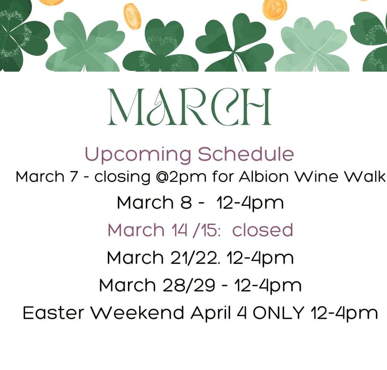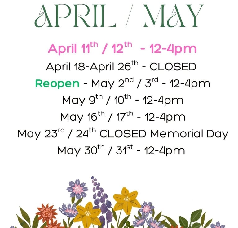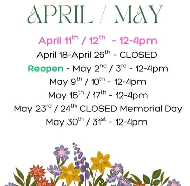 The above is our schedule for the upcoming weeks. If you would like to visit outside of our posted hours, please message or call us to set up a time to visit.